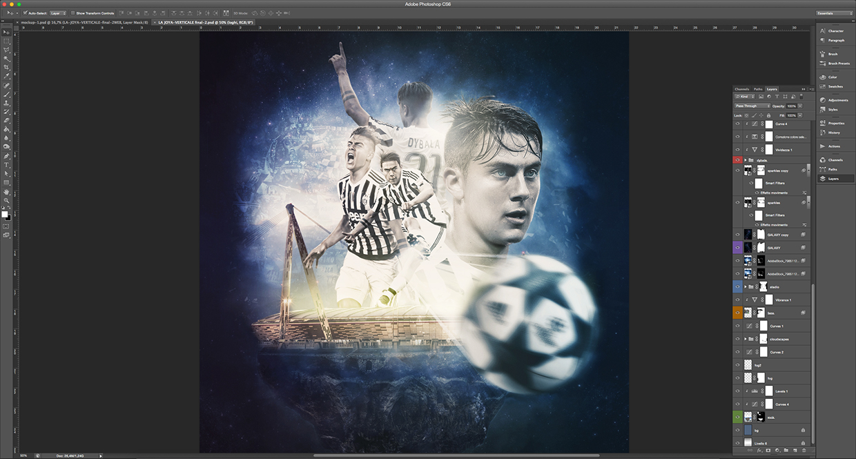 Paulo Dybala is the new darling of Turin. The Argentinian striker has had a sensational debut 2015/16 season for Juventus, scoring 23 goals. Here, art director Raffaele Conti, creates a very stylish poster of La Joya, combining multiple renders and a slick stadium background.